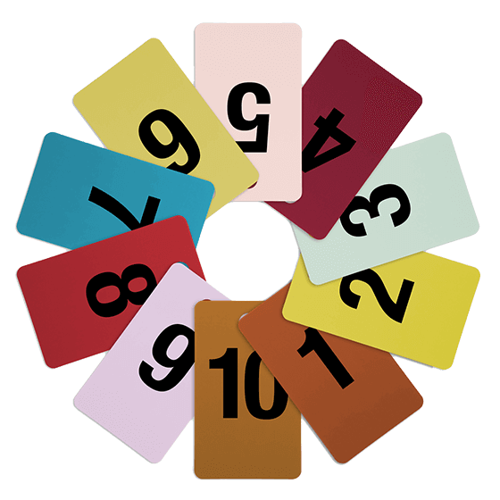 Los estilos incluyen: Tarjetas en código de color de 1-10 o de 1-7. Tarjetas de pomo en blanco de 1-5 y rectangular en color negro o blanco de 1-6. El paquete consiste de 1 conjunto completo de cada estilo.
